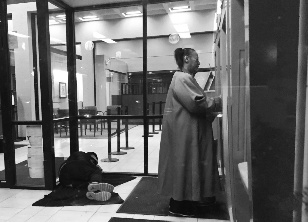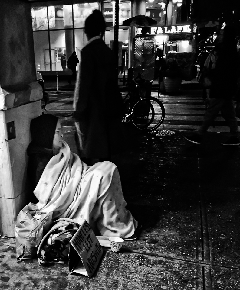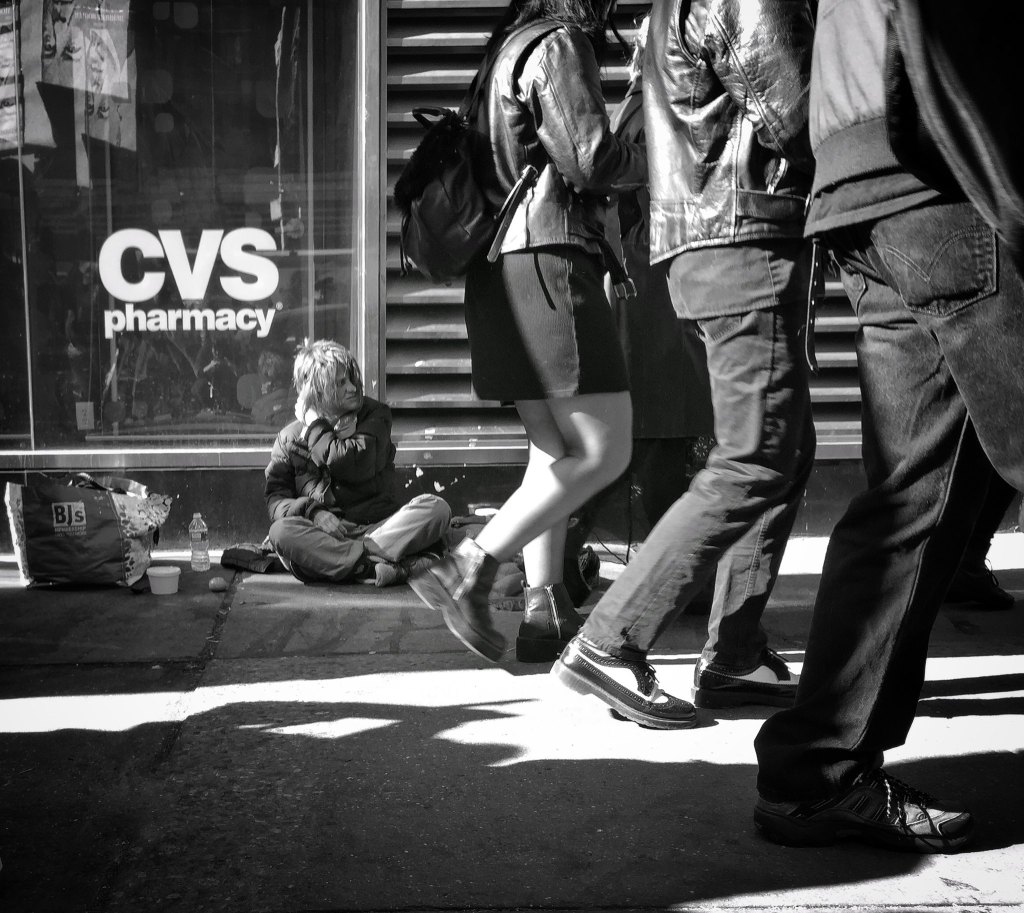 I have witnessed amazing compassion and absolute tragedy in this city; the numbingly mundane (smoke breaks, kids playing) is constantly mixed with jarring horror (sudden death, cruel class disparity) in city life. I’ve sat with ODs and the unconscious until the ambulances (eventually) arrived, witnessed cops throw a drunk homeless man against a wall like a rag doll, encountered people literally rotting, seen people assaulted and cuffed, watched helplessly as a homeless man died suddenly of a heart attack on the street. It has felt at times like combat photography, a maddening message no one cared to listen to – and yet, for so long, I felt a compulsion to relentlessly record it. This body of work has not come without thoughts of guilt, philosophical questioning, and despair.